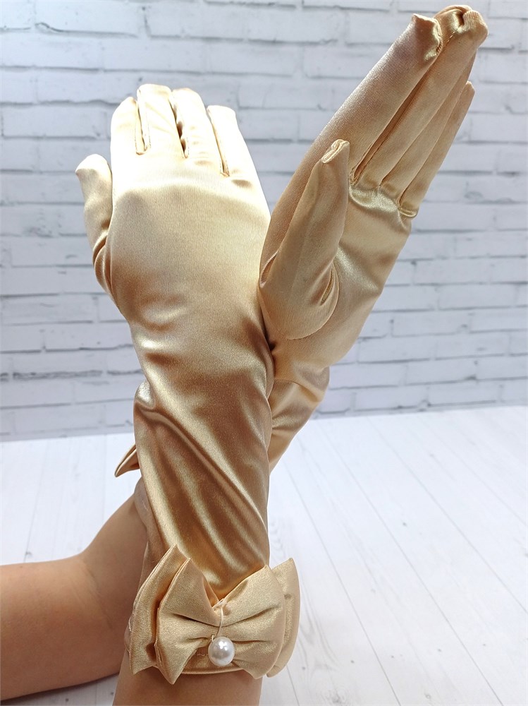 Детские перчатки атласные длинные с бантиком, бежевые