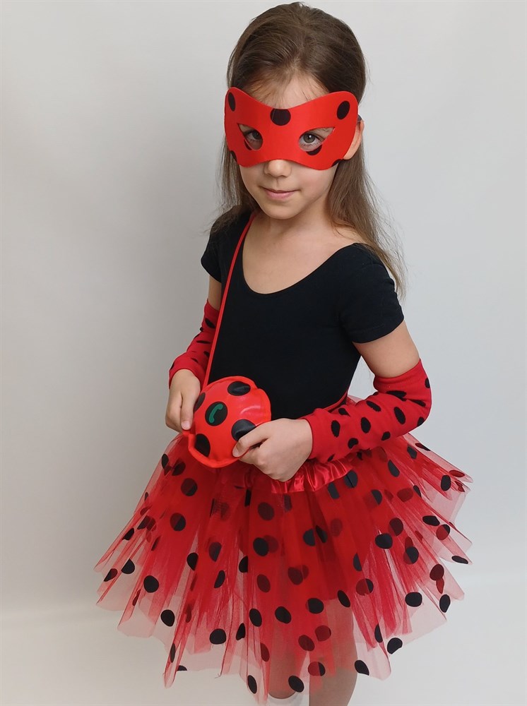 В комплект Божья коровка входит: юбка красная в черный горох, митенки на руки, маска, сумочка.