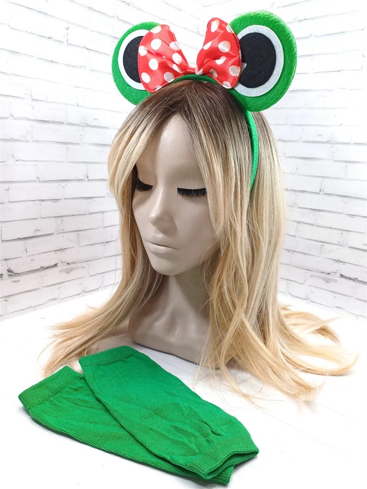 Комплект Лягушка с бантиком: ободок и зеленые митенки.